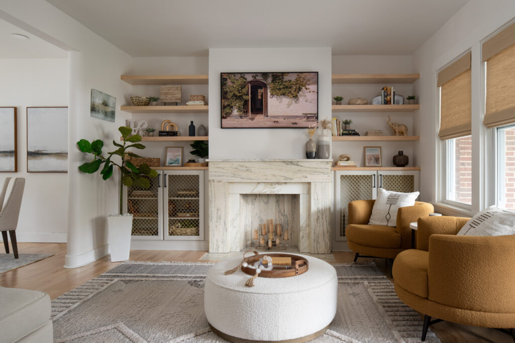 We encouraged our client to preserve the fireplace, reframing it not as an outdated element, but as a character-rich anchor for the space. Once restored and thoughtfully styled, it became a captivating focal point—one that grounds the room in history while allowing the surrounding design to feel fresh and intentional.